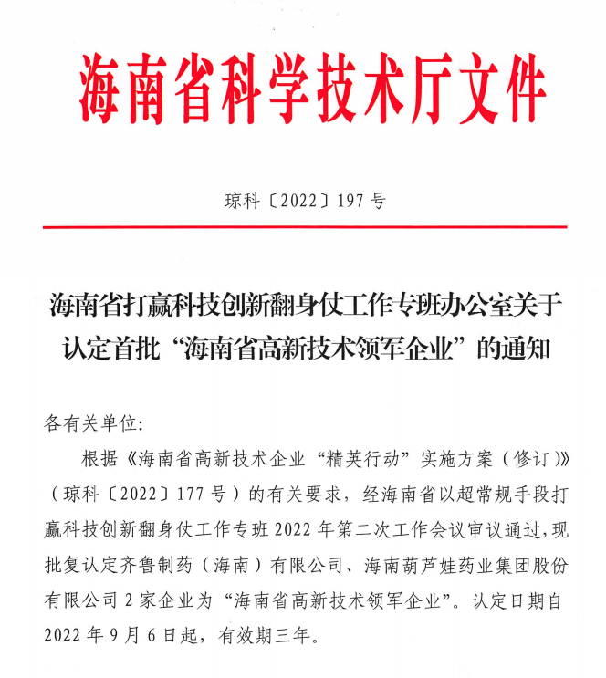 ¿Ê±Ò©Òµ¼¯Íű»È϶¨ÎªÊ×Åú¡°º£ÄÏÊ¡¸ßÐÂÊÖÒÕÁì¾üÆóÒµ¡±